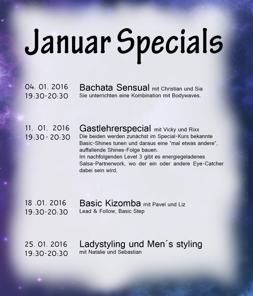 einer Kombination von Bodywaves in der Bachata Sensual. Die Woche drauf bekommen wir Besuch von unseren befreundeten Gastlehrern Vicky und Rixx, die nicht nur den Special mit Shine-Folgen aufpeppen, sondern auch anschließend noch den Level 3 mit ihrer Engerie bereichern. Am dritten Montag werden Pavel und Liz auch mal wieder die Kizomba ins Programm aufnehmen und die Basics unterrichten. In der letzten Woche werden Sebastian und Natalie dann noch ein Doppelstyling oben drauf setzen und für die Männer und die Damen etwas dabei haben.